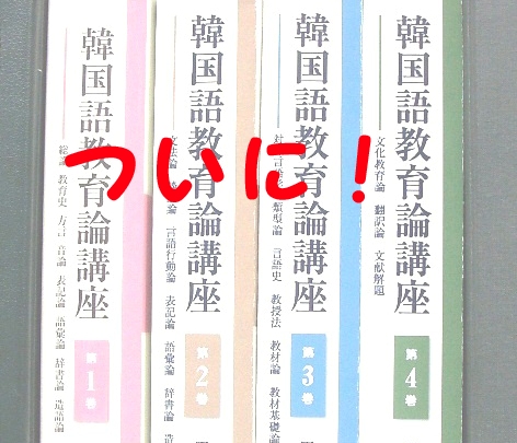第1巻は727ページ.ISBN 978-4-87424-374-9. 本体価格 4,700円+税 ●第4巻は817ページ.ISBN 978-4-87424-410-4 ●2007年5月12日夜8時の韓国の全国ネットSBSテレビニュースで『韓国語教育論講座』の刊行が報道されました ●韓国のインターネット聯合ニュースでも報道されました●明治書院『日本語学』2007年8月号pp.86-87で紹介されました.国立国語研究所の井上優先生の執筆です.●大修館書店『月刊言語』2007年10月号巻頭エッセイ「書物をつくる--ことばを学び=教えるために」で触れています.野間秀樹の執筆です. ●朝鮮学会の学会誌『朝鮮学報』第207輯(2008年4月26日発行)に第1巻の書評が5ページにわたって掲載されています.岡山大学大学院教授・辻星児先生の執筆です.pp.137-141.「文字通り画期的な著作である」などのお褒めのことばを頂戴しています.書評原文はこちらです.書評韓国語訳(金南听訳)のpdfはこちらです. ●『朝鮮学報』第210輯(2009年3月26日発行)に第4巻の書評が5ページにわたって掲載されています.早稲田大学名誉教授・大村益夫先生の執筆です.pp.129-133.